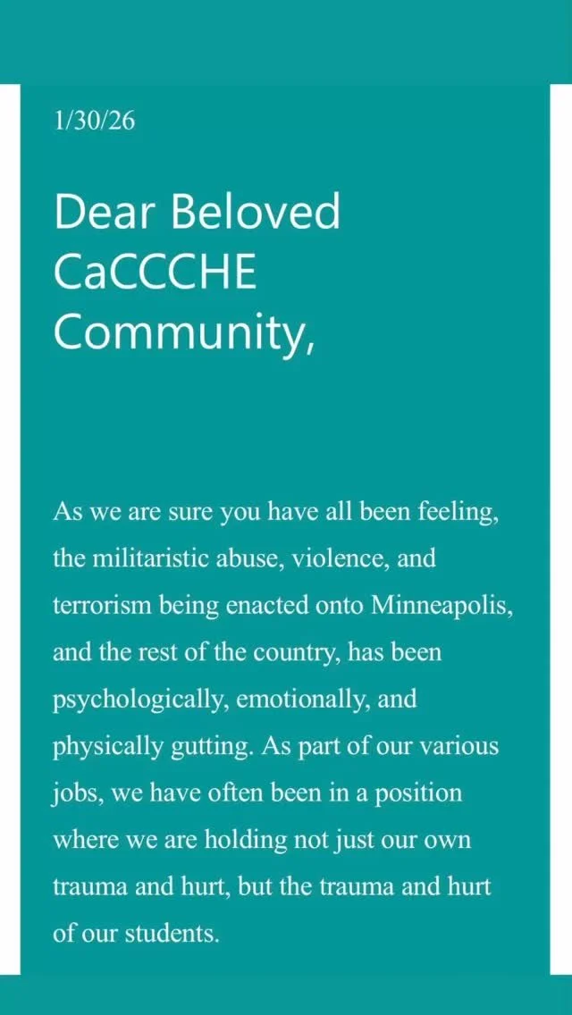 CaCCCHE is a coalition of professionals who are committed to social justice, equity, and diversity work on college campuses. Whether you work in a Cross Cultural Center, Multicultural Center, Mosaic Center, Diversity, Equity or Inclusion Center, Ethnic-Specific Center, Women's Center, Gender Equity Center, LGBTQIA Center, Social Justice Programs, or are a faculty member or a graduate student, we welcome you!